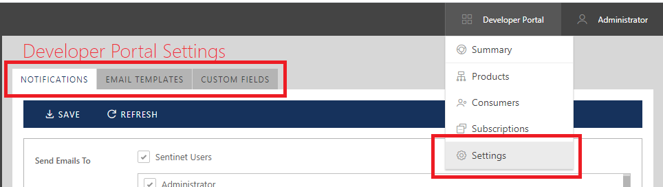Select Developer Portal -> Settings menu option to configure Developer Portal with the settings controlled from the Sentinet Administrative Console. The settings are grouped by categories represented by the top-level tabs, NOTIFICATIONS, EMAIL TEMPLATES and CUSTOM FIELDS.