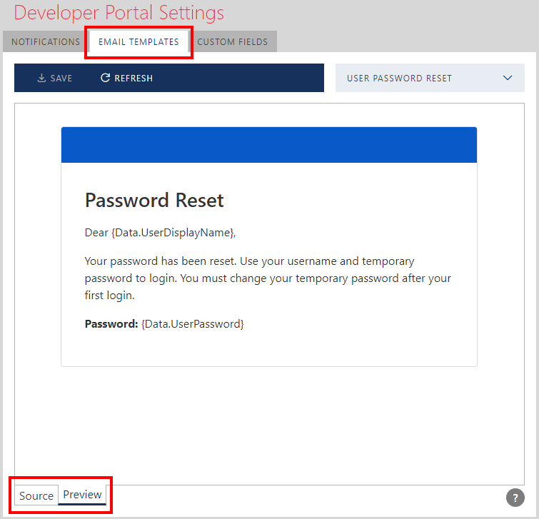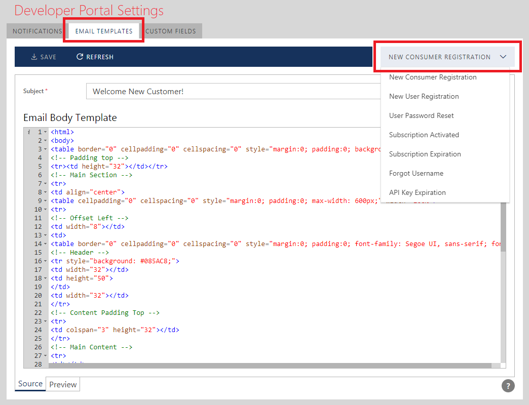 EMAIL TEMPLATES tab allows Sentinet Administrative Console Users to specify HTML templates for notification emails that will be received by the Developer Portal Users. Each email template can be selected and modified using the drop-down template selection menu.