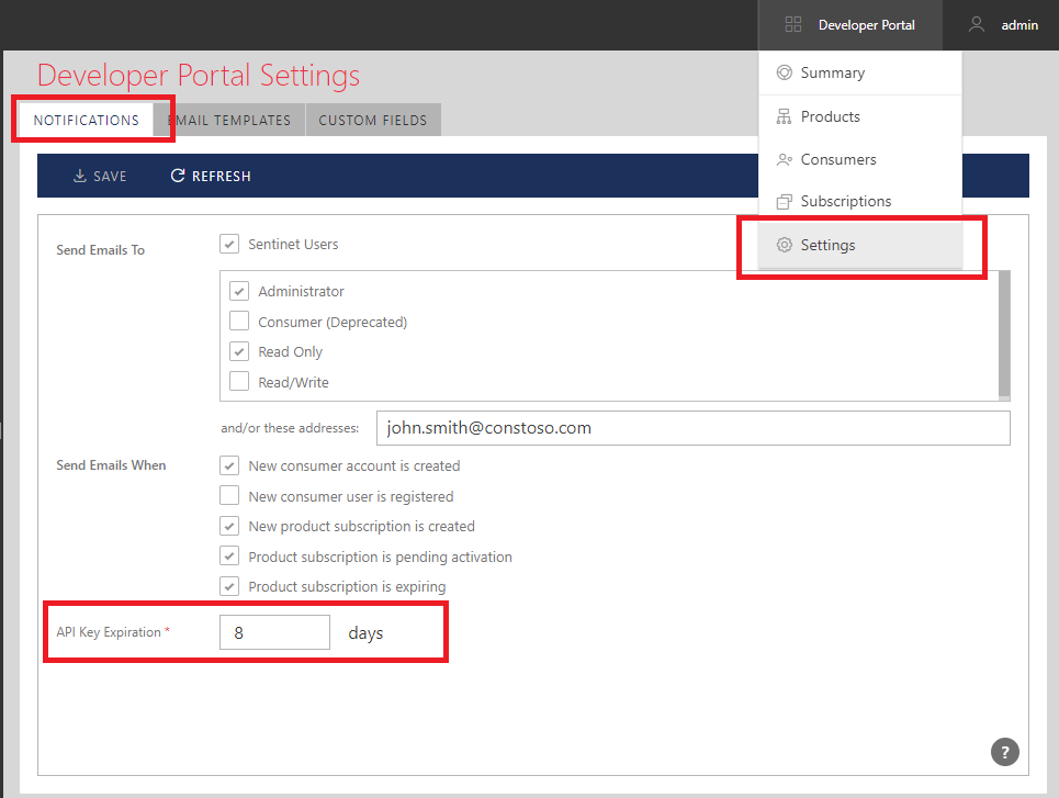API Key Expiration field specifies number of days when Developer Portal Users start receiving notification emails about expiring API Keys.