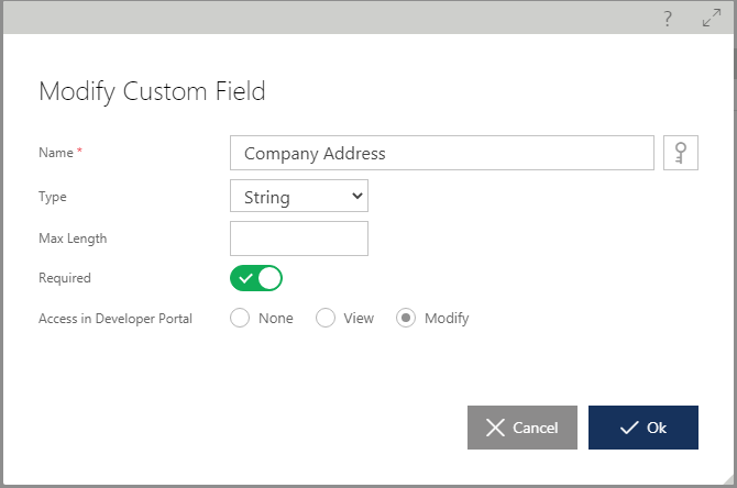 - Modify - Custom Field can be viewed and can be modified in the Developer Portal by the Developer Portal Users.