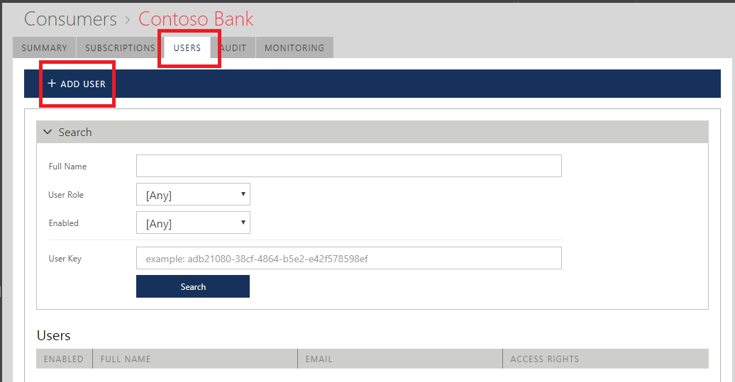 Click + ADD USER toolbar button to add new user account to a Consumer account.