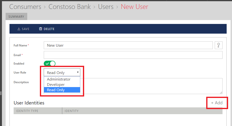 User Role -- user role assigned to a new Developer Portal User account created for this Consumer account.