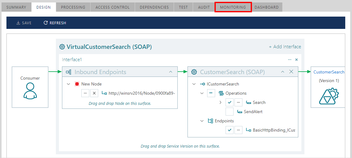 Monitoring Select the MONITORING tab to view real-time and historical service transactions monitoring data (see the Monitoring chapter for more details on the Sentinet monitoring capabilities). Figure. MONITORING tab.