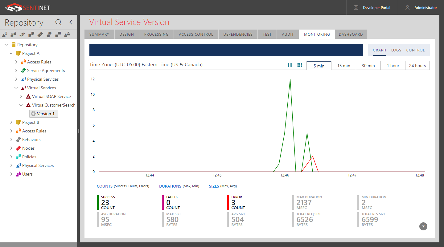 Monitoring is available through real-time charts for the last 5, 15 or 30 minutes, 1 hour or 24 hours.
