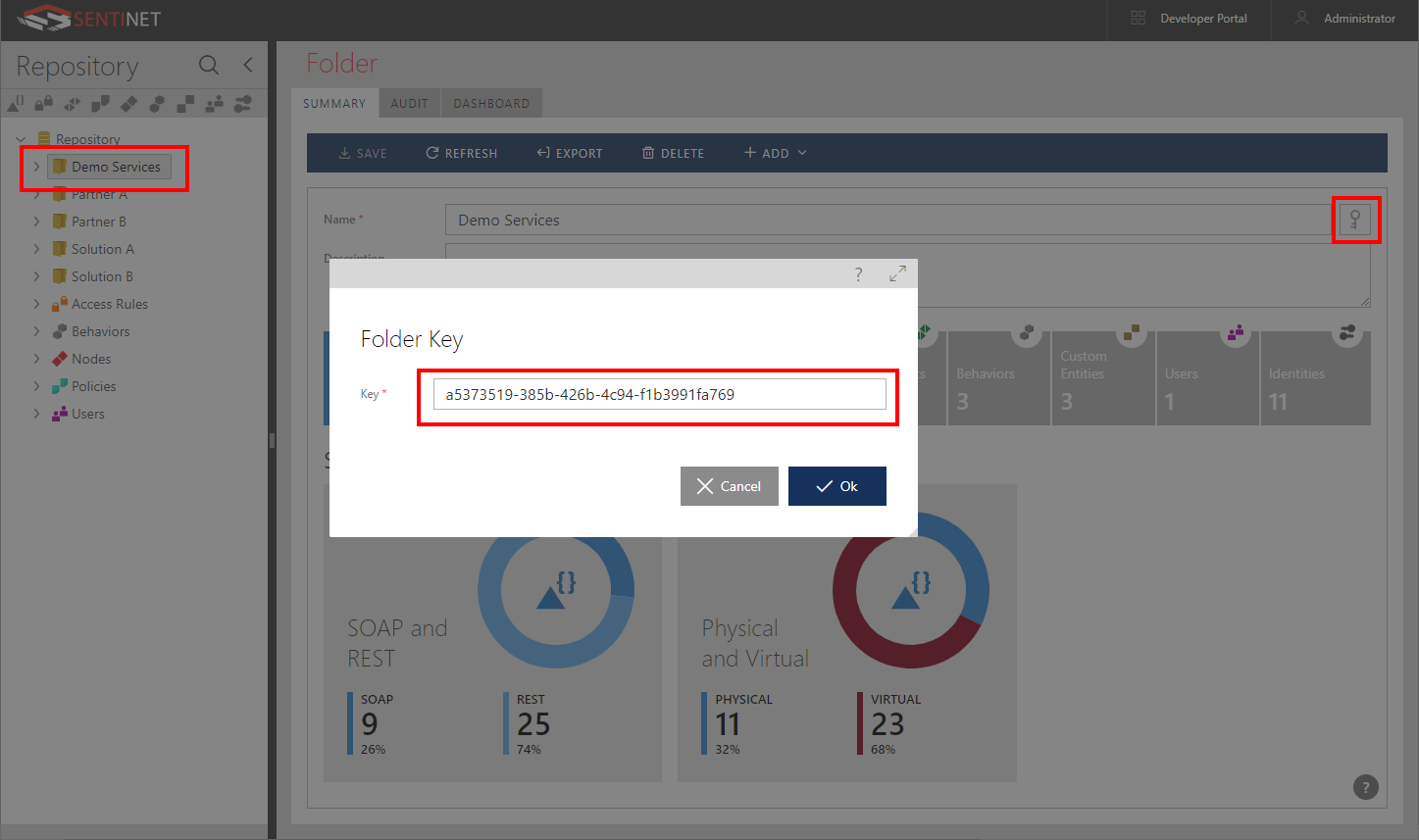 Every entity registered in the Repository is identified by its unique Key, which is a GUID. The Keys are auto-generated by the Sentinet infrastructure when entities are created or registered in the Repository for the first time. It is not typical that Sentinet users would ever need to change them, even though it is entirely possible, and can be done with no impact on the system. The only more or less typical case when the Key may need to be changed, is when Sentinet Node’s Key must be changed in order to put different Sentinet environment in sync with each other for the smooth export/import feature.
