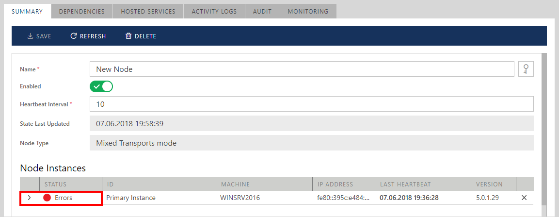 At the same time, even if a single virtual service fails to be activated, a Node will also be listed in the Error state. Note, that the failed virtual service does not affect any other hosted virtual services.