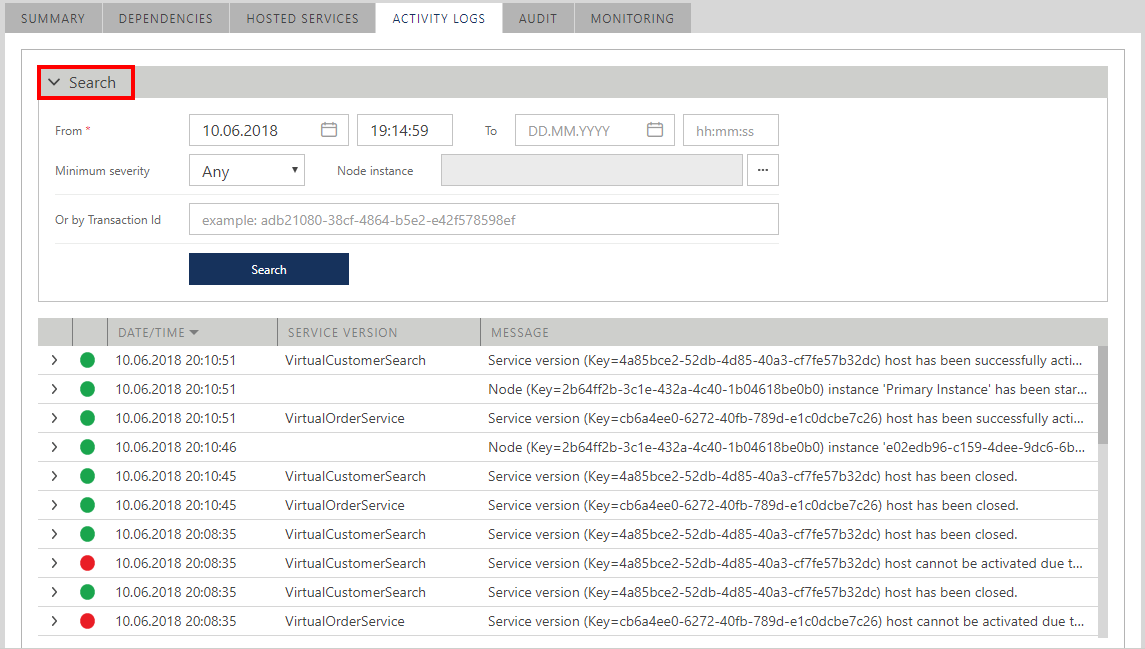 By default, Sentinet shows all Activity Logs for the last 1 hour. Click Search button to show advanced search options. These options allow to review Activity Logs for any other time periods, to filter Activity Logs by severity, specific Node Instance or by searching for errors related to a specific transaction. Advanced Search options are automatically displayed if default 1-hour search does not return any Activity Logs.
