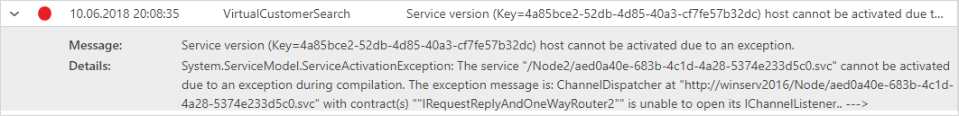 Each Activity Log record can be further expanded to show details of the related record. For example, figure below shows details of a virtual service activation error that allows identification of the reason for service activation failure. Service version Key can be used to search for this service in the Repository to identify specific service that failed to be activated.