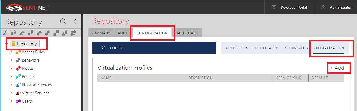 Select Repository tree root item, CONFIGURATION tab and VIRTUALIZATION sub-tab. Click +Add button to add a new Virtualization Profile to the list of managed virtualization profiles.
