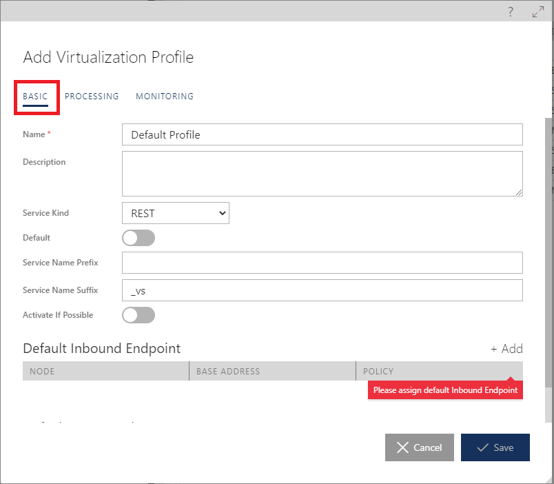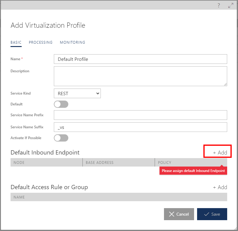 Figure. +Add button to add default inbound endpoint A Virtualization Profile may have only one inbound endpoint configured, which means that “one-click” virtualization always creates a new virtual service version with one endpoint only.