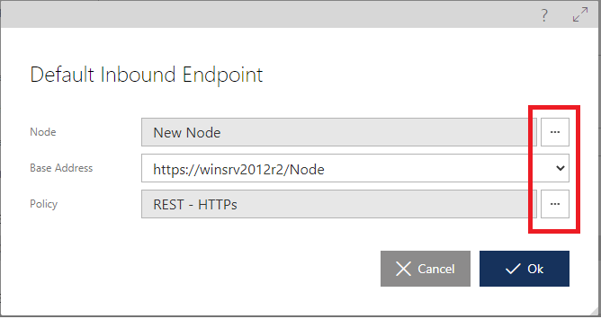 Figure. Default Inbound Endpoint dialog box with selection buttons and a drop-down. When selecting Node, you are asked to navigate in the Repository tree to select Sentinet Node that will host virtual services created through this Virtualization Profile. Once Node is selected, Base Address drop-down will be populated with all base addresses of selected Node.