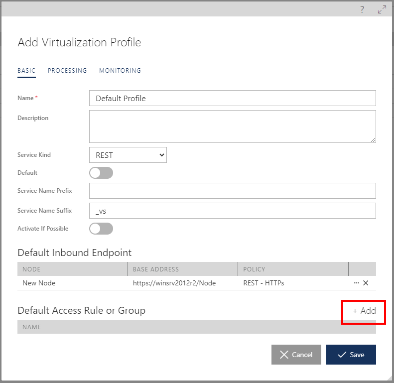 Figure. +Add button to add default Access Rule Only one Access Rule or Access Rule Group can be added to a Virtualization Profile. When you click +Add button, you are asked to navigate in the Repository tree to select Access Rule or Access Rule Group, which will be assigned to the Access Control of virtual services created through this Virtualization Profile.