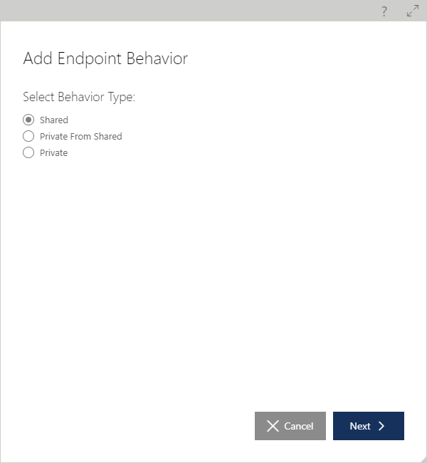 Just as endpoint policies, endpoint behaviors can be either private or shared (see Endpoint Policy chapter that describes the process of selecting shared vs private policy. The process is similar to selecting shared or private behaviors).