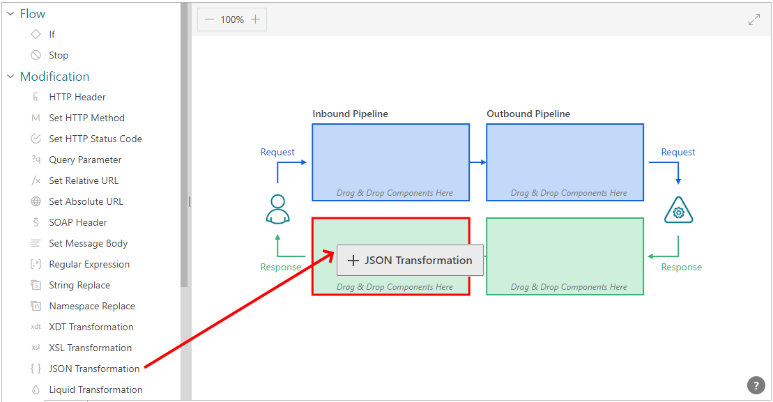 JSON Transformation component can be placed in both Request-Inbound and Response-Inbound pipelines.